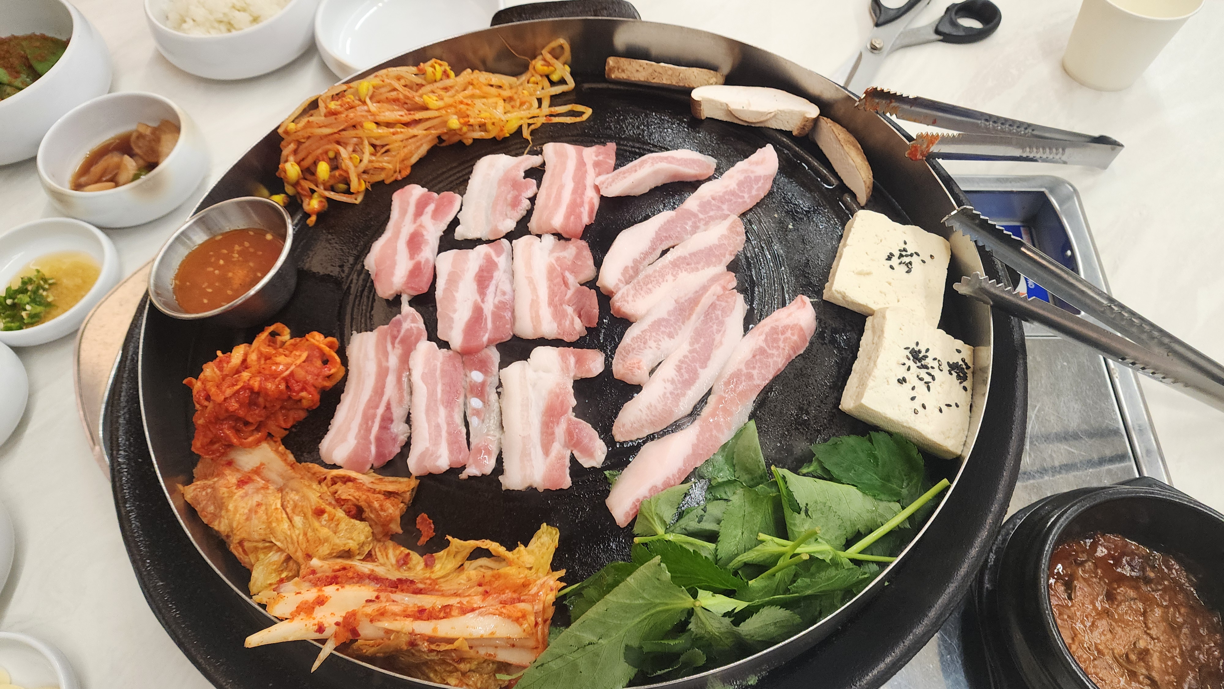 점심특선 메뉴로 생대패 쌈밥 정식 2인(29,000원)을 주문했습니다. 이 곳은 밑반찬이 기본으로 잘 나오는데 고기판 위에 올라가는 반찬도 많습니다. 고기판 위에 올라가는 반찬은 추가요청하면 더 주시고, 그냥 밑반찬은 셀프코너에서 가져오시면 됩니다. 쌈도 셀프로 가져와서 더 드시면 됩니다. 개인적으로 파절임이 맛있어서 추가요청하게 되더라구요. 미리 양념안하시고 그때그때 양념하는 맛이었습니다.
