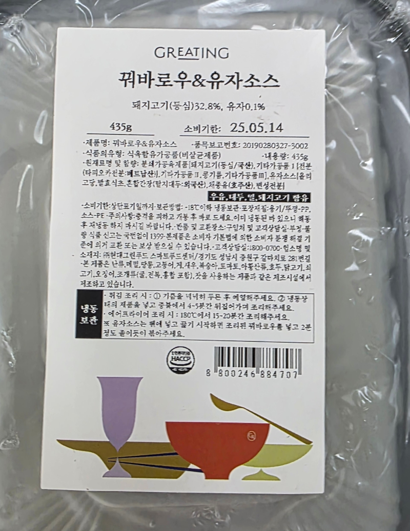 결론부터 말씀드리면 쏘쏘입니다. 현대 브리핑에서 주문한 냉동식품입니다. 꿔바로우 고기와 유자 소스가 들어 있습니다.