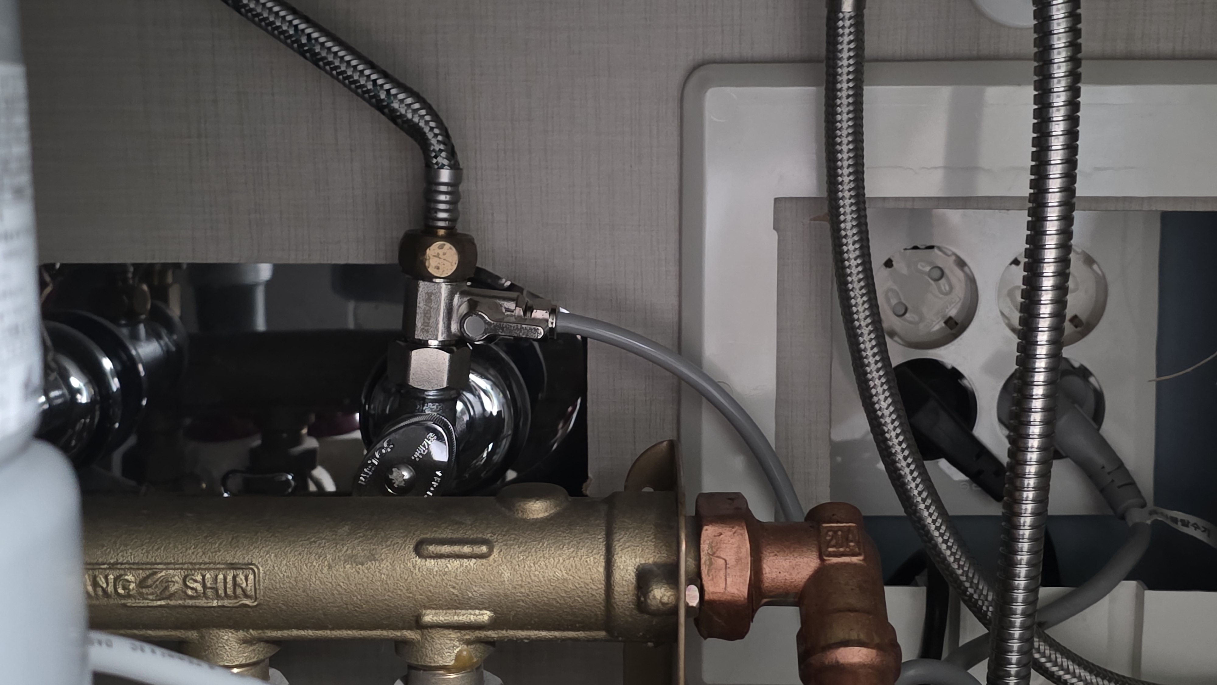 제품은 싱크대 옆 공간에 설치했고, 배수는 싱크대 쪽으로 바로 빼주었습니다. 급수는 싱크대 하단 배관에서 T자형 연결부를 통해 따서 연결했고, 기사님이 직접 방문하여 10mm 배관을 타고 안정적으로 급수 연결을 마무리해주셨습니다.