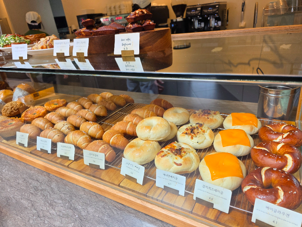 주문 카운터 근처에는 빵과 디저트가 풍성하게 진열되어 있습니다. 소금빵, 베이글, 크림치즈빵, 마늘 바게트, 맘모스, 팡도르, 식빵 등 종류별로 다양하게 준비되어 있으며, 시간마다 새로운 빵이 나오기 때문에 여러 번 방문해도 질리지 않습니다.