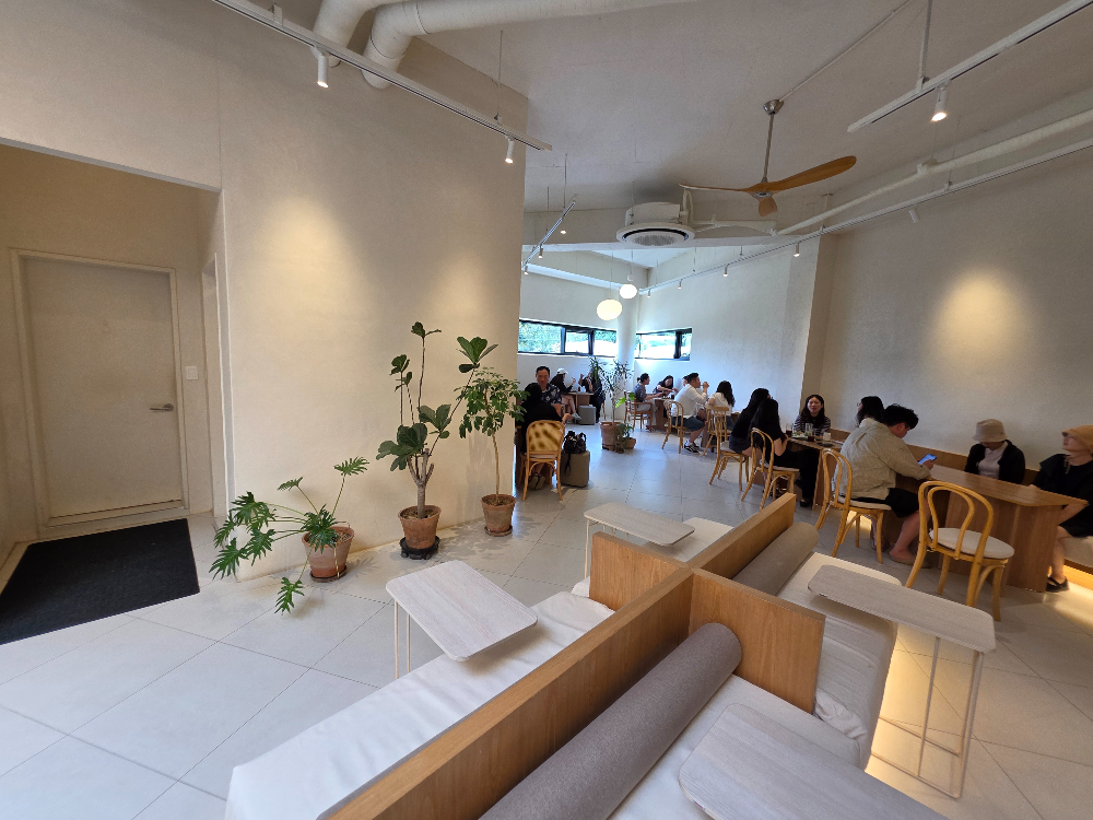 내부는 층고가 높고 통유리창을 통해 햇살이 쏟아지는 구조로, 자연을 바라보며 휴식하기에 최적입니다. 좌석이 여유롭게 배치되어 있어 가족이나 단체로 와도 넉넉한 공간을 제공합니다. 아이 동반을 고려한 아늑한 좌석과 넓직한 테이블, 그리고 곳곳에 설치된 콘센트 덕분에 노트북도 부담 없이 사용할 수 있습니다.
