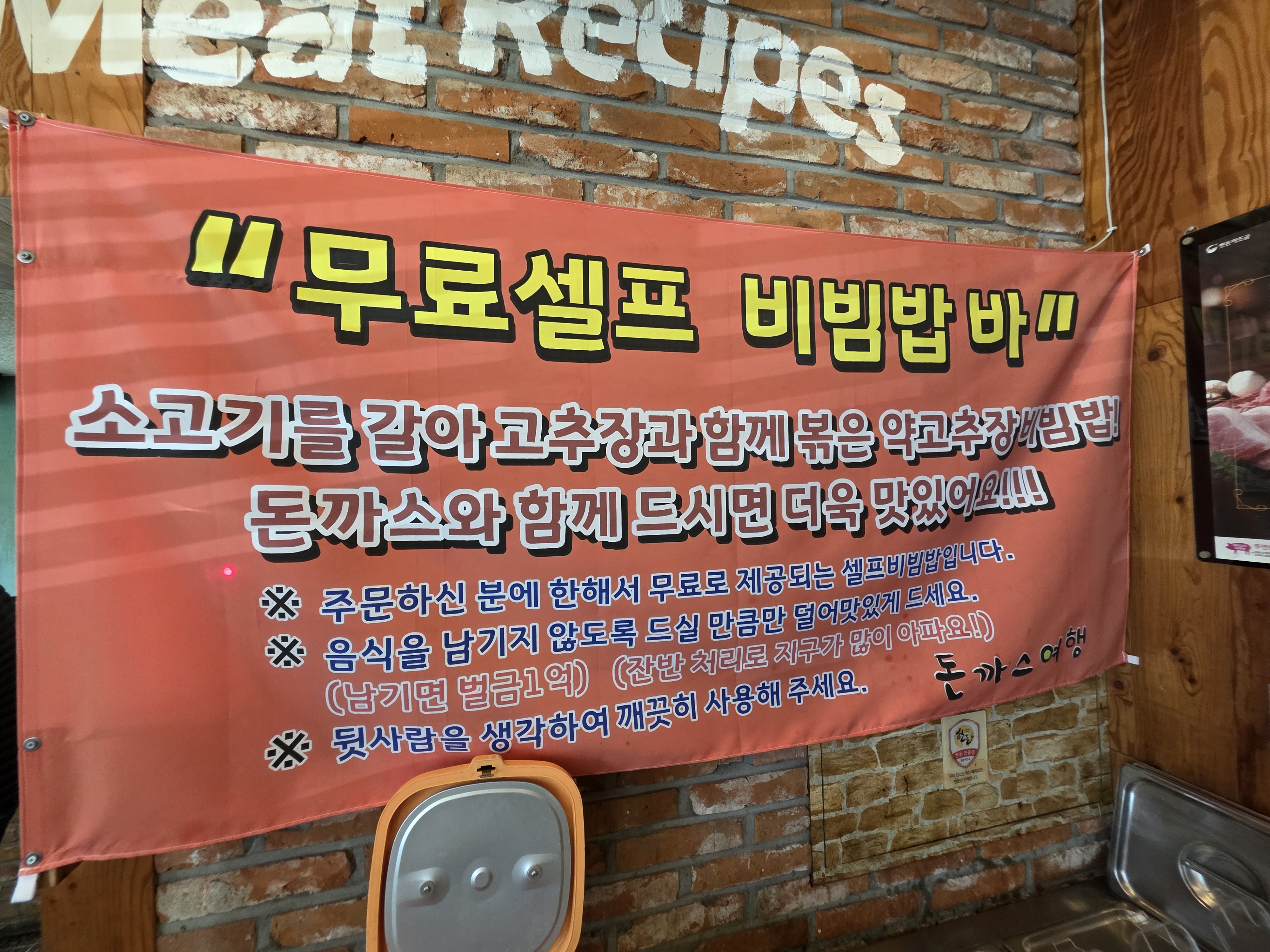 돈까스여행의 가장 큰 매력 포인트는 바로 무제한 셀프 비빔밥 코너다. 가게 한쪽에 준비된 셀프바에서 밥과 나물, 채소, 고추장 양념 등을 자유롭게 덜어 비빔밥을 만들어 먹을 수 있는데, 이 비빔밥이 무료라는 점이 많은 손님들에게 ‘혜자 맛집’이라는 인상을 준다.