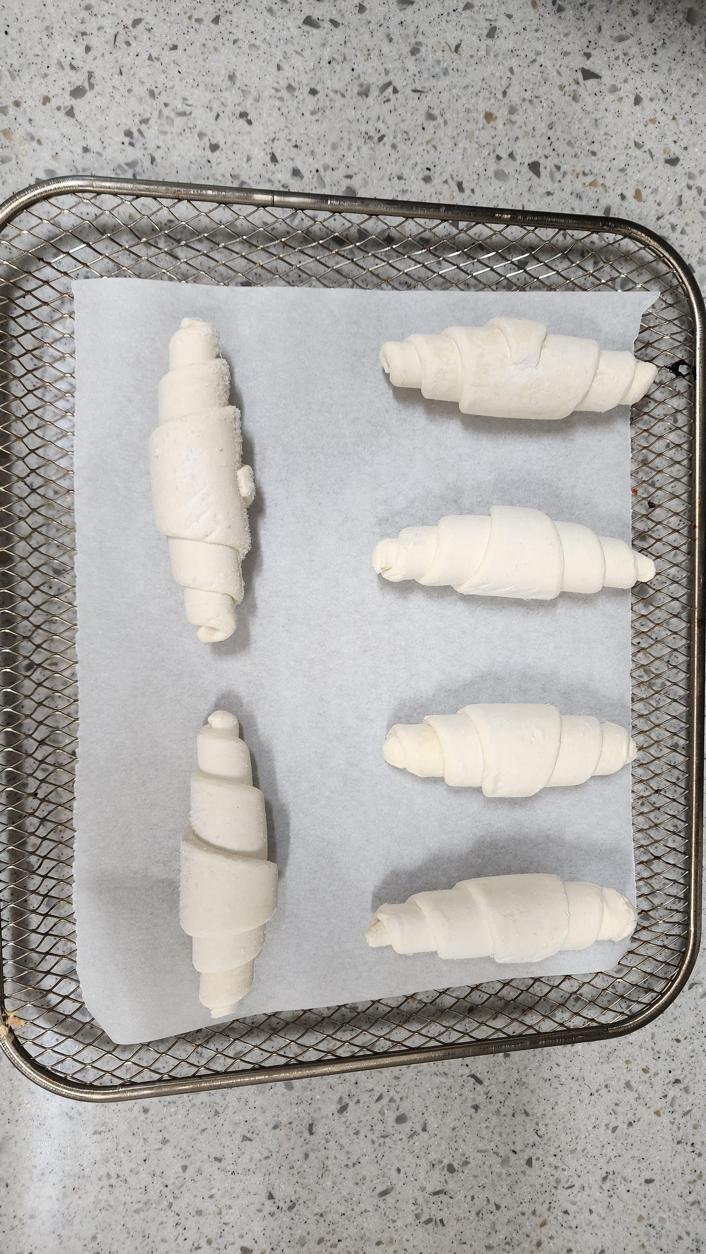 빵이 서로 닿지 않게 잘 배열을 하셔야 합니다. 빵이 서로 닿으면 그 부분은 그냥 하얀색으로 보이기 때문에 시각적으로 별로입니다. 각자의 에어프라이기에 맞게 잘 배열하시는 것이 각자의 노하우가 될 것 같네요. 아래 사진은 완성된 크로와상 사진입니다.