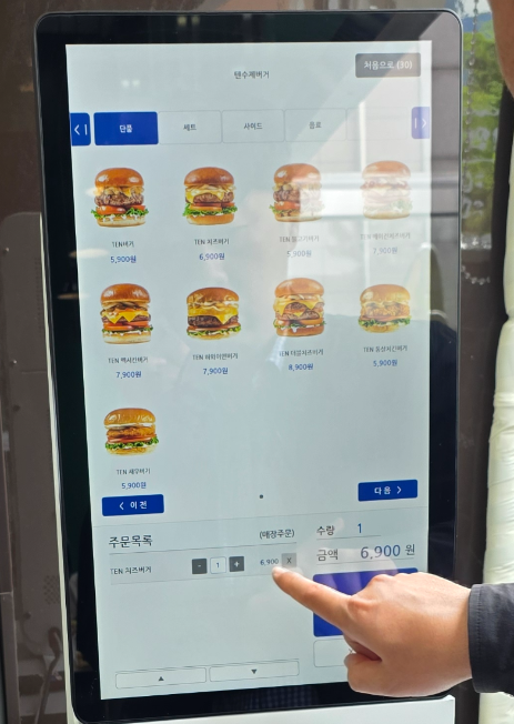 텐버거에서는 주문을 키오스크를 통해 하도록 되어 있어 간편하게 메뉴를 선택할 수 있습니다. 메뉴판도 잘 정리되어 있어 처음 방문한 사람도 어렵지 않게 이용 가능합니다.